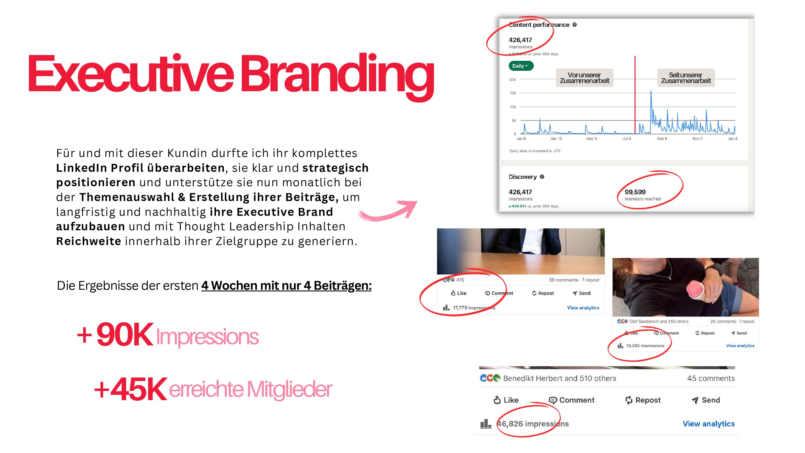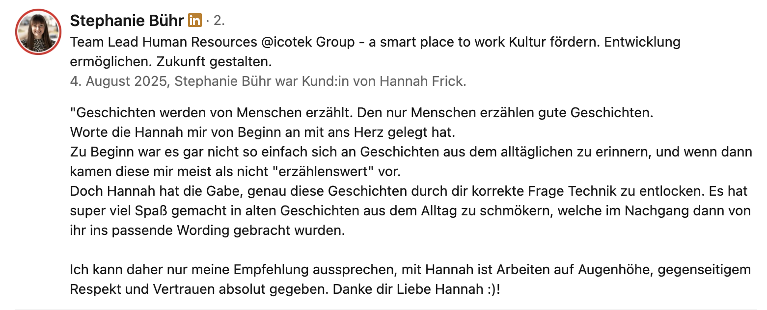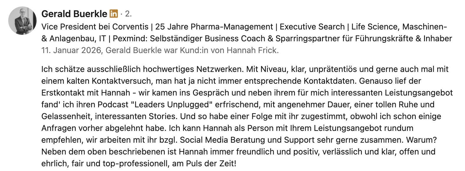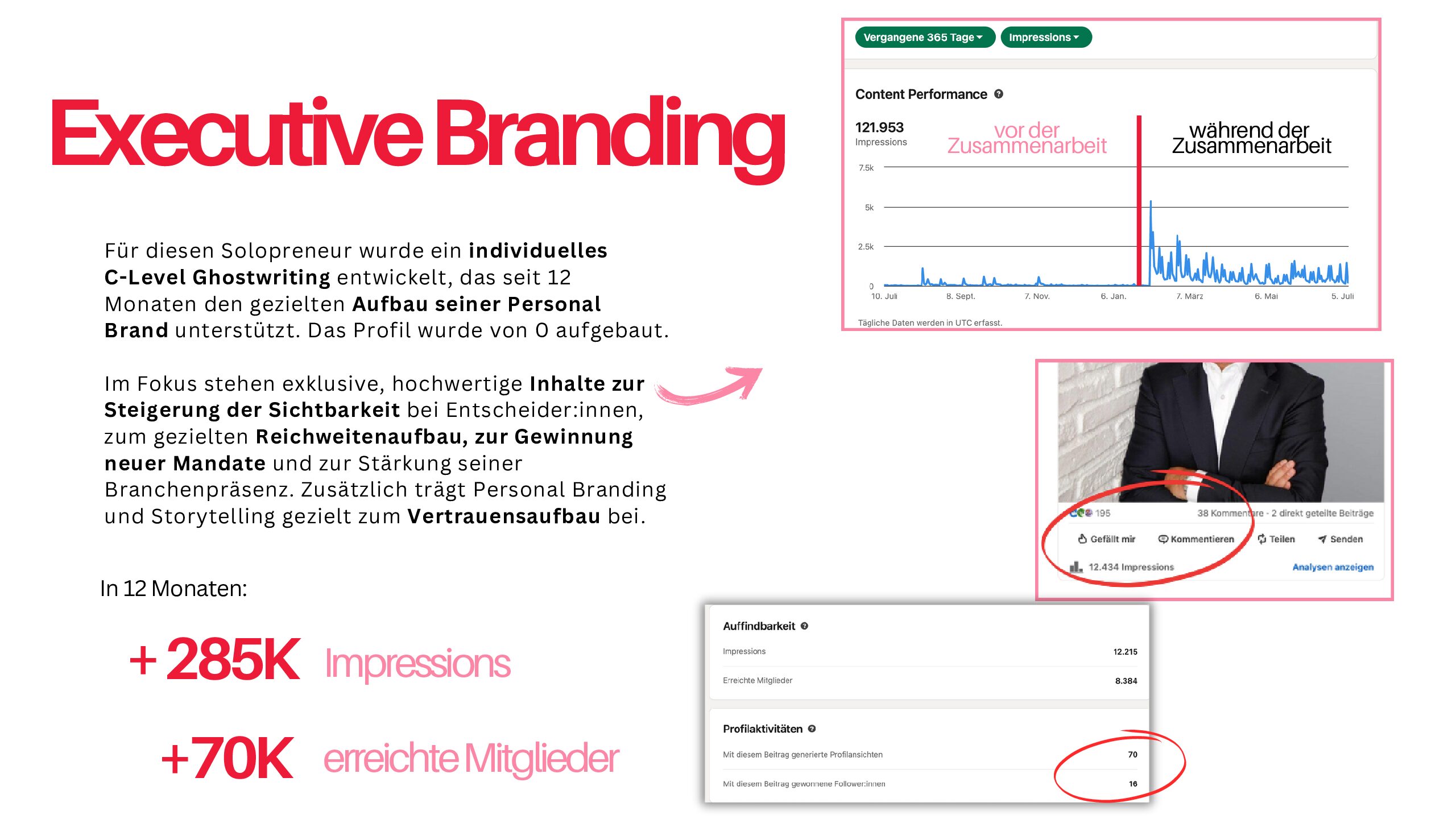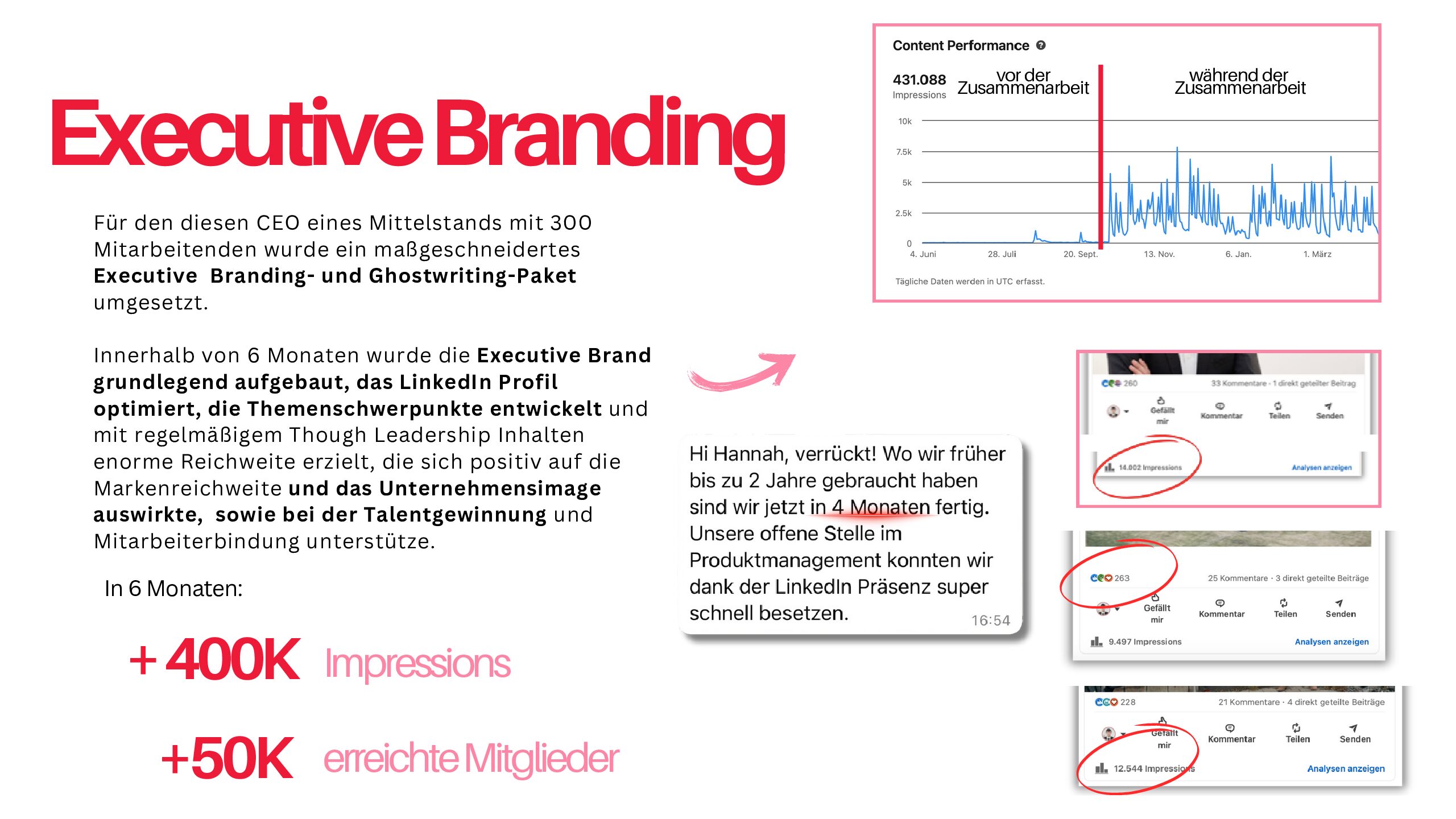 Ein Praxisbeispiel: Ein CEO aus dem Mittelstand (ca. 300 Mitarbeitende) erzielte durch Profiloptimierung, Contentstrategie und Ghostwriting über 500.000 Impressionen in sechs Monaten. Der messbare ROI: Eine Führungsposition wurde in vier Monaten statt zwei Jahren besetzt – sechsmal schneller.