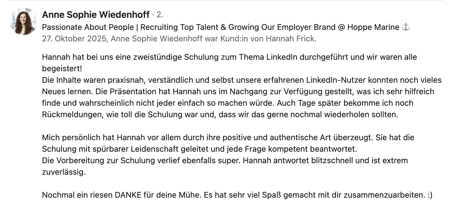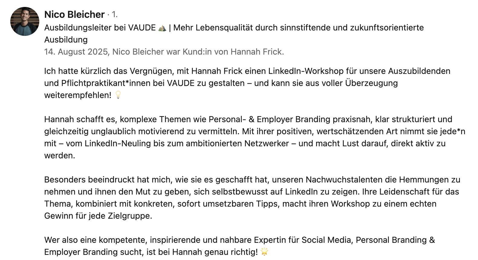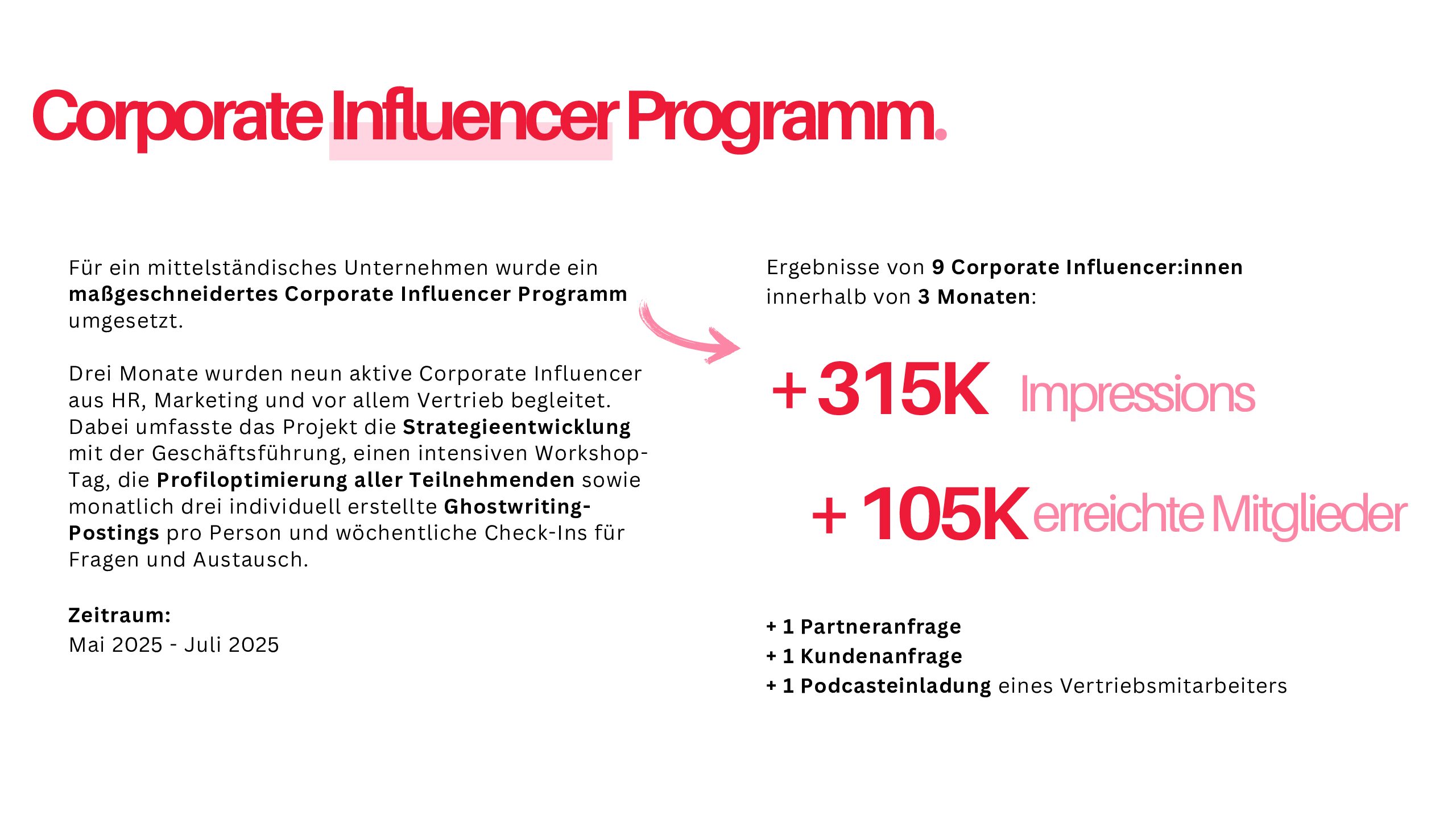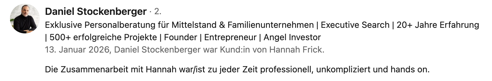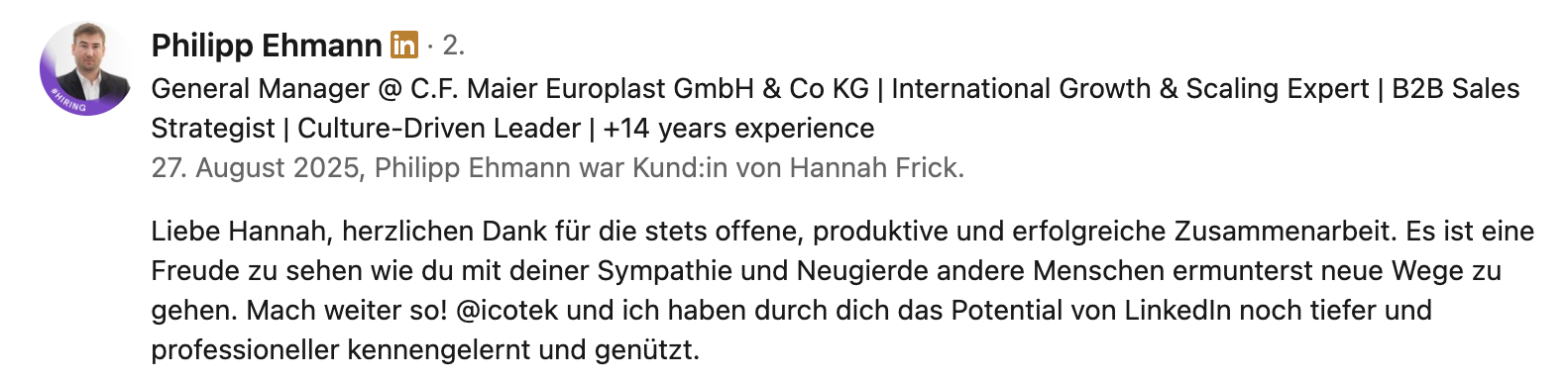Ein Praxisbeispiel: Ein CEO aus dem Mittelstand (ca. 300 Mitarbeitende) erzielte durch Profiloptimierung, Contentstrategie und Ghostwriting über 500.000 Impressionen in sechs Monaten. Der messbare ROI: Eine Führungsposition wurde in vier Monaten statt zwei Jahren besetzt – sechsmal schneller.